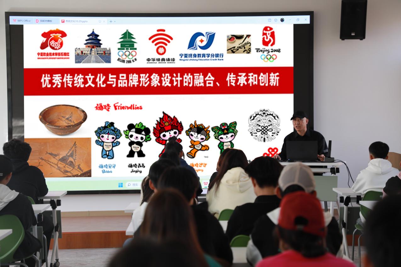 张勇老师《中华优秀传统文化和形象设计》讲座以中国汉字、书法、印章、传统云纹、中国古钱币、传统图案以及中华古图腾等元素融入现代形象设计为例,讲述自己设计的多件作品的丰富内涵,使同学们深刻认识到“形象设计融入中华优秀传统文化元素,就是对中国传统文化得继承和创新,有中华优秀传统文化元素的形象设计能让大家心里产生共鸣,更能够凝聚人的心灵。”另外,张老师利用中国书法以及书法笔触把英文融入其中,让更多的外国人不但能懂得书写内容,更深入了解中华优秀传统文化。